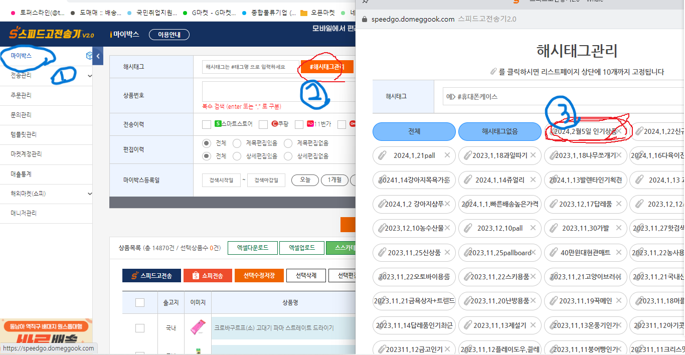 스피드고로 들어가서 위 왼쪽 클릭 => 해시태그관리 클릭 => 저장해놓은 인기상품 해시태그 클릭 합니다