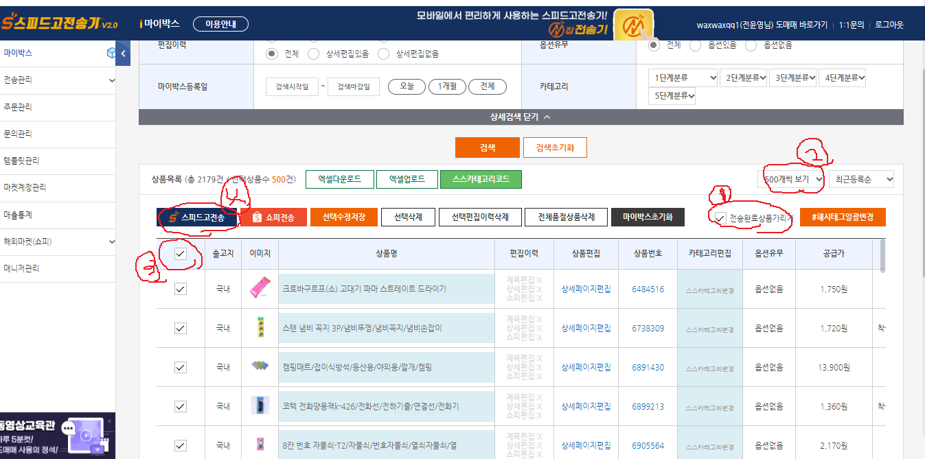 4. 오픈마켓에 소싱한상품 500개 스피드고로 전송하기