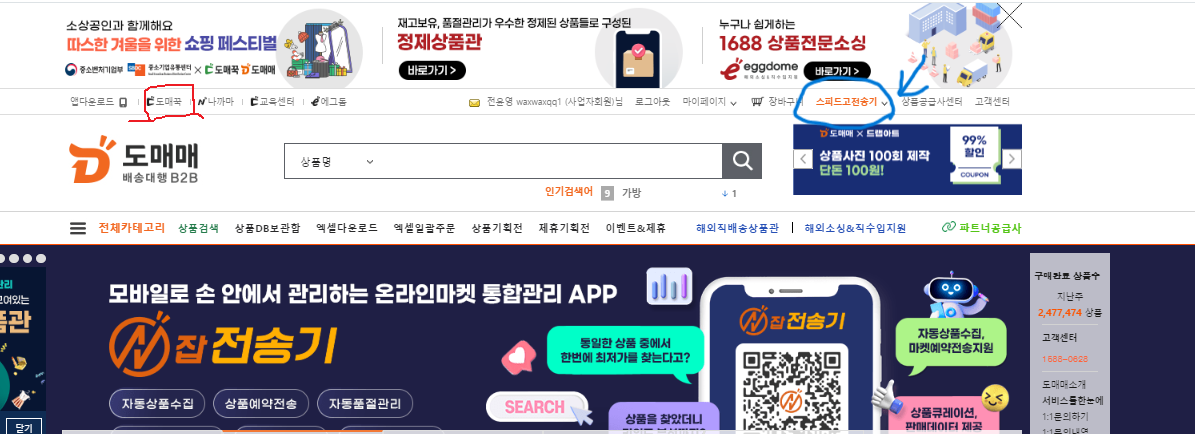 도매매를 이용하는 셀러들은 위 사진 우측(파랑)에 스피드고라는 곳에 커서를 놓으면 위에 스피드고2.0이라고 뜨는데 그곳을 클릭해서 들어가면 대량등록 할수있는 시스템으로 입장 하는 것이다.